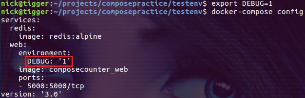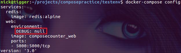 這種情況下,如果沒有在當(dāng)前的 shell 中導(dǎo)出環(huán)境變量 DEBUG,compose file 中會把它解釋為 null: