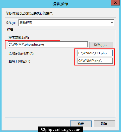 4、再來配置需要執行的“操作”,就是選擇所寫的程序或是BAT文件,這里很重要的配置是選擇BAT文件后,在“起始于(可選)”這里一定要填寫相應執行程序或是BAT文件的所在目錄,要不然是執行不成功的。
