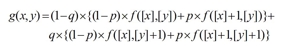 resultPic(x+1,y+1,:)=double(oriPic(fv,fu,:)).*(1-pv).*(1-pu)+...