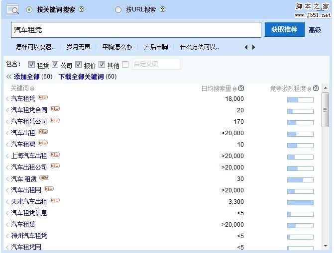 1、復(fù)數(shù)形式——這是一個普遍的關(guān)鍵詞擴(kuò)展方法。你可以把“大量汽車租憑”加到你的關(guān)鍵詞表單中去。