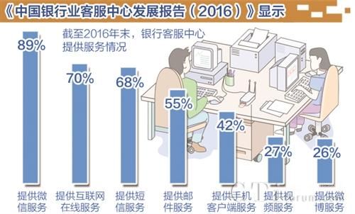 中國(guó)銀行業(yè)協(xié)會(huì)7月5日在北京發(fā)布的《中國(guó)銀行業(yè)客服中心發(fā)展報(bào)告(2016)》顯示,截至2016年末,提供微信服務(wù)的客服中心占比89%,提供互聯(lián)網(wǎng)渠道在線服務(wù)的客服中心占比70%,提供短信服務(wù)的客服中心占比68%,提供郵件服務(wù)的客服中心占比55%,提供手機(jī)客戶端(APP)服務(wù)的客服中心占比42%,提供視頻服務(wù)的客服中心占比27%,提供微博服務(wù)的客服中心占比26%。