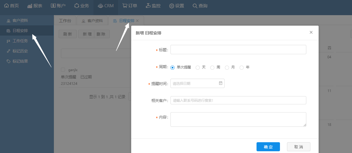 日程安排,與鬧鐘功能非常相似,既可以設置成單次提醒,也可以設置成循環周期性提醒,周期可以設置為天、月、周、年。 點擊新增按鈕彈出如下圖所示的數據配置框, 配置完數據,點擊確定按鈕新建日程安排成功。