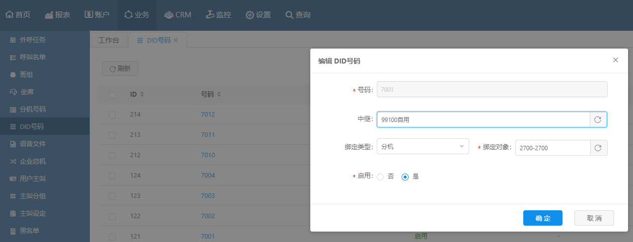 (2)配置轉接對象。登錄到企業賬戶,打開業務配置頁面下的DID號碼頁面,刷新頁面編輯大號是61302353的記錄,綁定類型選擇坐席,設置好大號接聽的坐席,點擊確認即可。