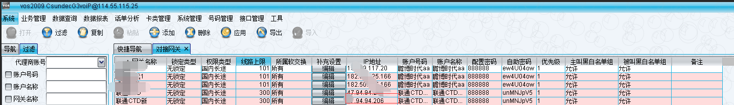 如下圖所示,登錄到vos之后,依次選擇業務管理->網關業務->對接網關,打開界面之后點擊新增按鈕,IP地址處填寫運營商線路IP地址192.168.1.11,填寫賬戶與密碼,最后點擊應用按鈕新建成功,此時運營商線路對接vos成功。