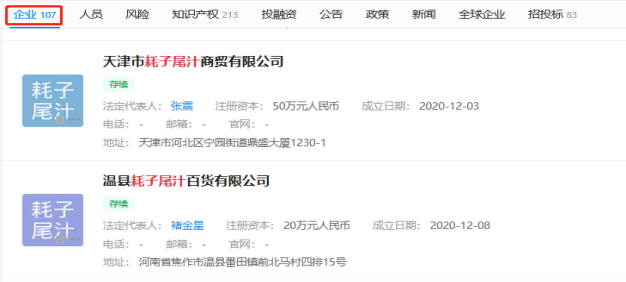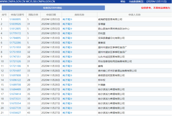 然而,我們?cè)谕婀#思以诓錈岫茸錾狻?/section>據(jù)中國(guó)商標(biāo)網(wǎng)數(shù)據(jù)顯示,從11月11日開(kāi)始,就陸續(xù)有208條“耗子尾汁”的商標(biāo)注冊(cè)記錄,分類(lèi)也是五花八門(mén),啤酒飲料、醫(yī)藥衛(wèi)生、廣告銷(xiāo)售、科學(xué)儀器、餐飲住宿等等都有。